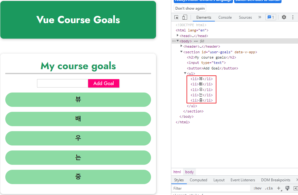 이제 결과를 확인해보면 각각의 Goal이 잘 출력되고 개발자 도구를 보면 Goal을 추가할때마다 li 태그를 생성해서 추가해줍니다.